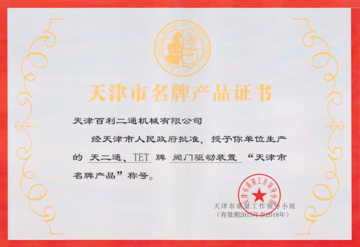 閥門驅(qū)動裝置名牌產(chǎn)品證書