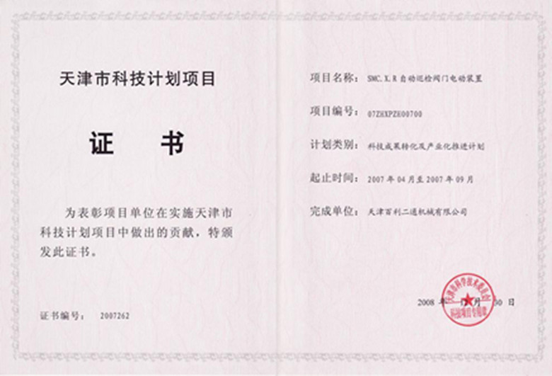 天津市科技計(jì)劃項(xiàng)目證書